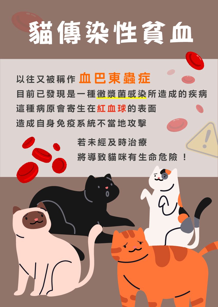 貓咪的傳染性貧血以往又被稱作血巴東蟲症,目前已發現是一種黴漿菌感染所造成的疾病,這種病原會寄生在紅血球的表面,造成自身免疫系統不當地攻擊紅血球細胞,若未經及時治療將導致貓咪有生命危險。