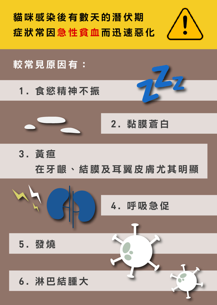 貓咪感染後有數天的潛伏期,症狀常因急性貧血而迅速惡化,常見症狀有