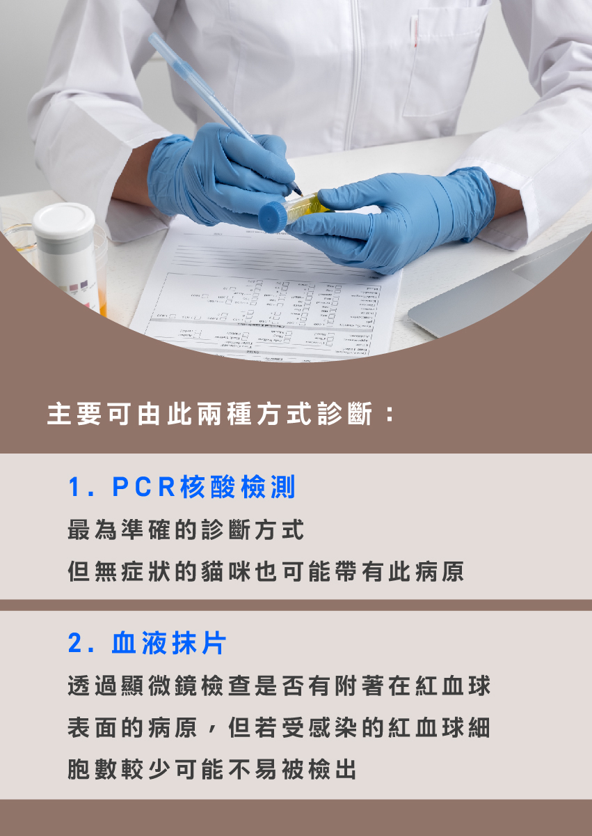 1. PCR核酸檢測- 最為準確的診斷方式,但無症狀的貓咪也可能帶有此病原