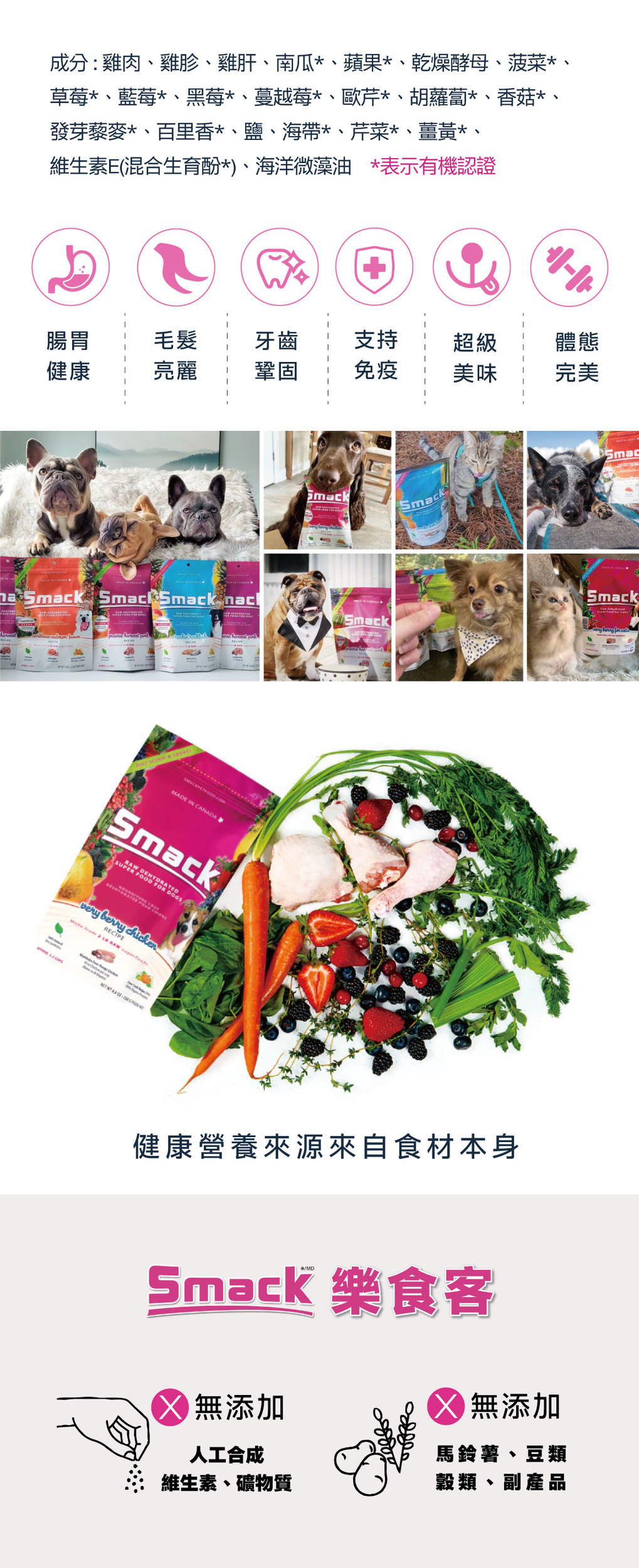成分: 雞肉、雞胗、雞肝、南瓜*、蘋果*、乾燥酵母、菠菜*、草莓*、藍莓*、黑莓*、 蔓越莓*、歐芹*、胡蘿蔔*、香菇*、發芽藜麥*、百里香*、鹽、海帶*、芹菜*、 薑黃*、維生素E(混合生育酚*)、海洋微藻油 *表示有機認證