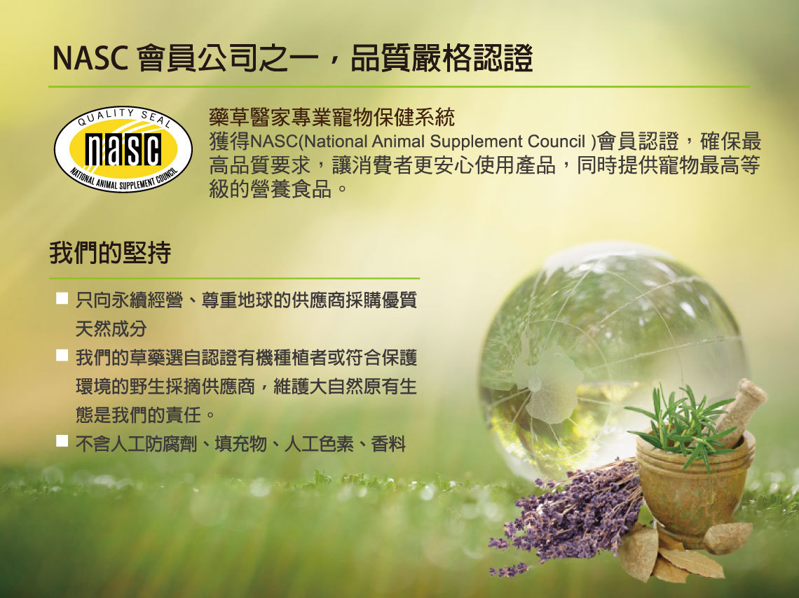藥草醫家專業寵物保健系統獲得NASC(National Animal Supplement Council )會員認證,確保最高品質要求,讓消費者更安心使用產品,同時提供寵物最高等級的營養食品