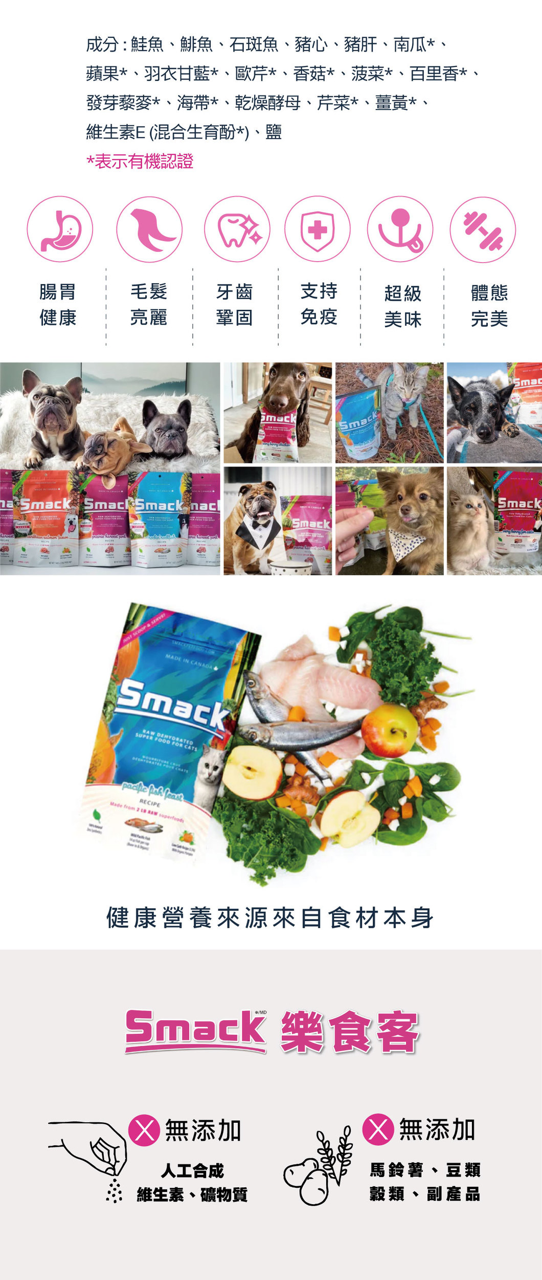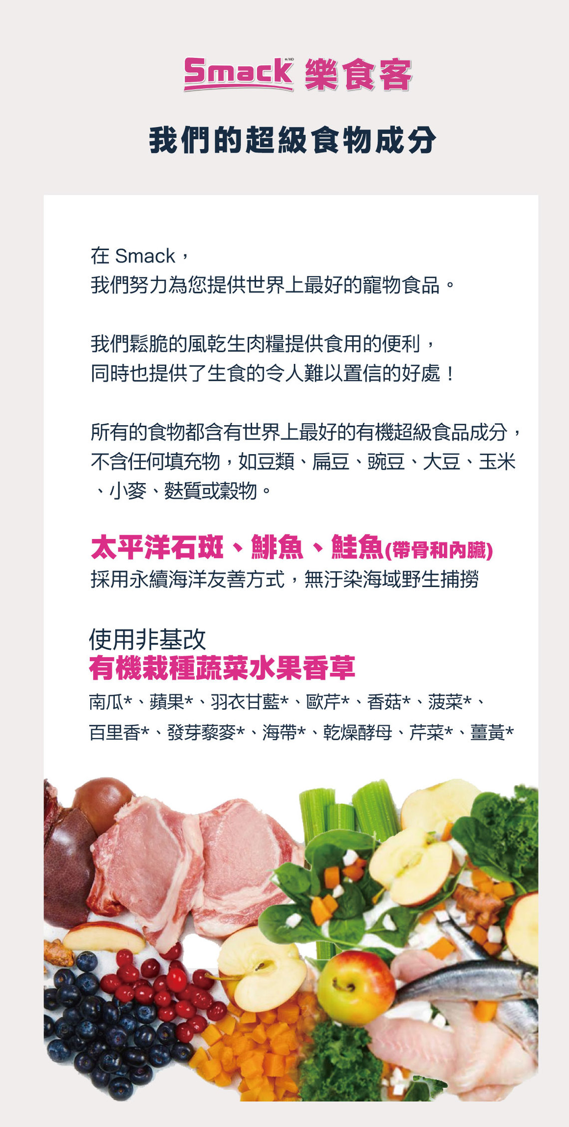 成分 : 成分 : 鮭魚、鯡魚、石斑魚、豬心、豬肝、南瓜*、蘋果*、羽衣甘藍*、歐芹*、香菇*、菠菜*、百里香*、