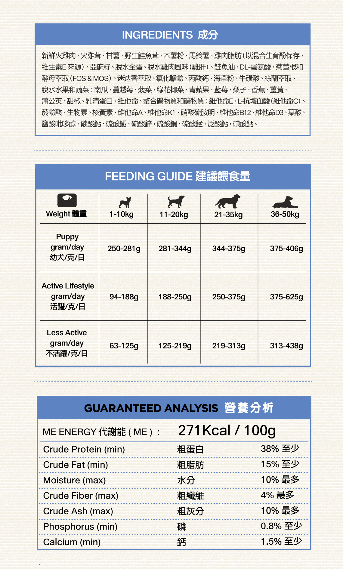成分:新鮮火雞肉、火雞茸、甘薯、野生鮭魚茸、木薯粉、馬鈴薯、雞肉脂肪(以混合生育酚保存、維生素E 來源)、亞麻籽、脫水全蛋、脫水雞肉風味(雞肝)、鮭魚油、DL-蛋氨酸、菊苣根和酵母萃取(FOS & MOS)、迷迭香萃取、氯化膽鹼、丙酸鈣、海帶粉、牛磺酸、絲蘭萃取、脫水水果和蔬菜:南瓜、蔓越莓、菠菜、綠花椰菜、青蘋果、藍莓、梨子、香蕉、薑黃、蒲公英、甜椒、乳清蛋白、維他命、螯合礦物質和礦物質:維他命E、L-抗壞血酸(維他命C)、菸鹼酸、生物素、核黃素、維他命A、維他命K1、硝酸硫胺明、維他命B12、維他命D3、葉酸、鹽酸吡哆醇、碳酸鈣、硫酸鐵、硫酸鋅,硫酸銅,硫酸錳,泛酸鈣,碘酸鈣。